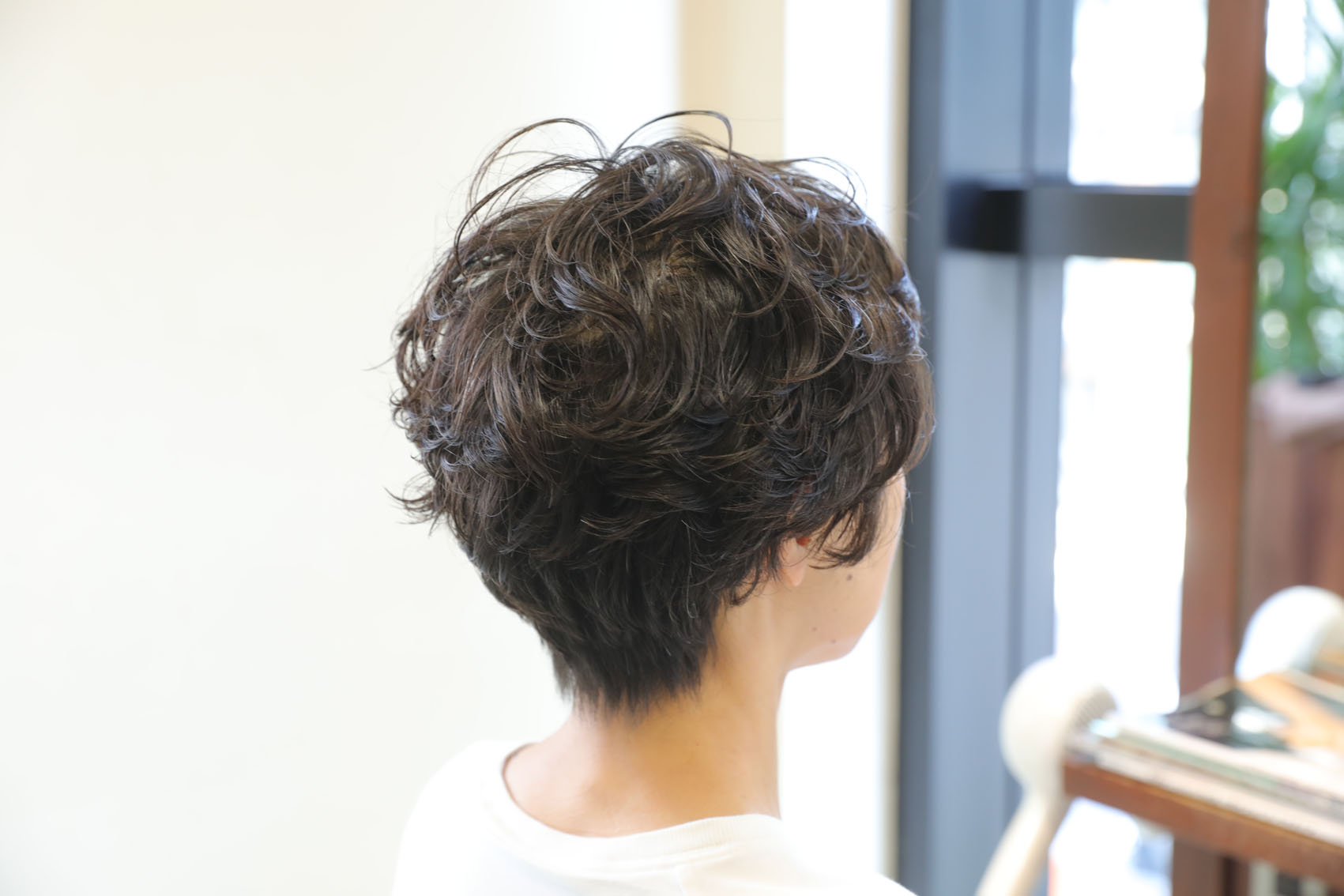 | 担当者からのワンポイントアドバイス | ショートスタイルで自然なボリュームを求めるなら、エアウェーブの機械を使ったパーマがおすすめ。 しっかりとカールがでるので大きめなカールでもしっかりと形になってスタイリングも簡単。 ざっと乾かしてスタイリング剤でカールを強調してあげるだけで、いつものスタイルがワンランク上の仕上がりになりますよ。 |