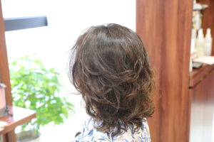 | 担当者からのワンポイントアドバイス | 毛量の少ないボリュームの出にくい髪質。 そのような髪質ならウェーブスタイルが有効です。 それも大きめなカールがしっかりと出るタイプのパーマなら、お手入れが簡単で素敵な仕上がりになりますよ。 |